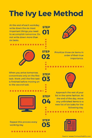 The Ivy Lee Method:. . . . . . . . During his 15 minutes with each executive, Ivy Lee explained this simple set of daily routine steps for achieving peak productivity: